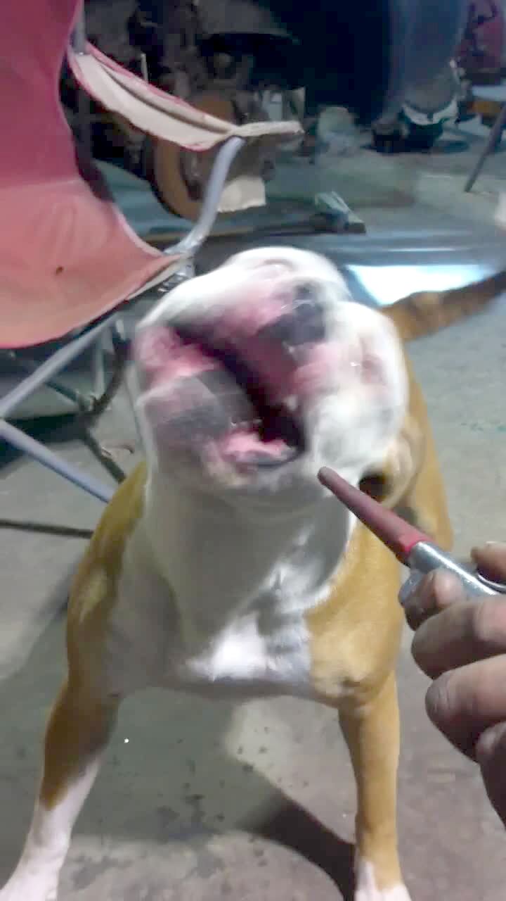 Ugly dog growls & bares teeth.