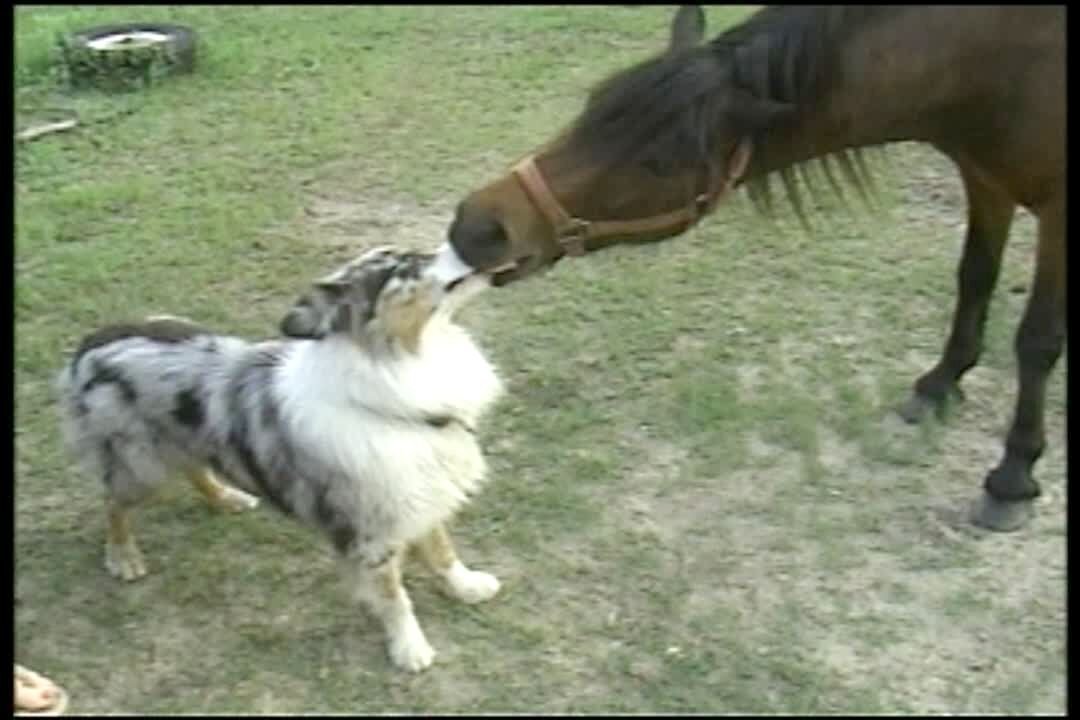 Horse and dog lick each other's tongues, looks like they're kissing.