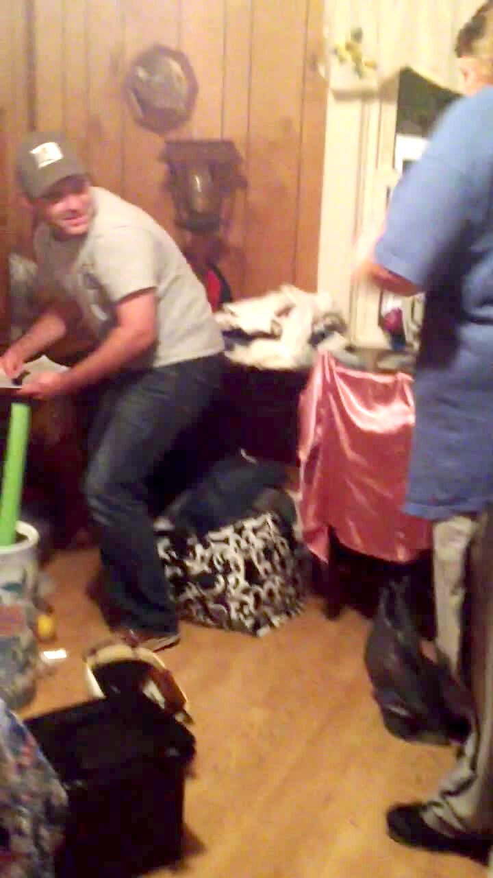 A woman opens a toy snake in a box on Christmas, screams, and falls off of a couch. Practical jokes. Scare.