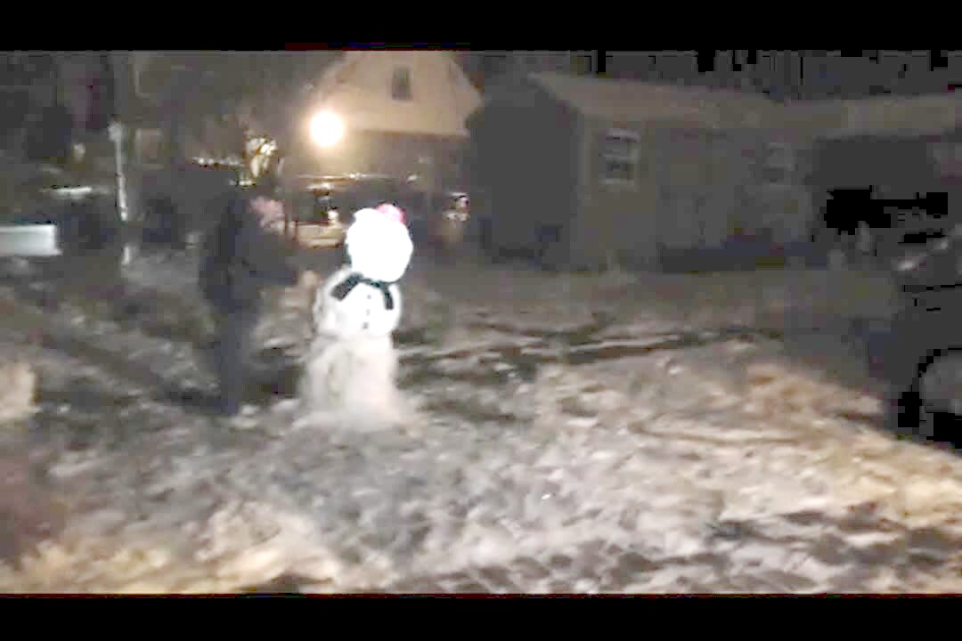 A group of men light fire crackers inside of a snowman and blow it up but the camera moves when it blows.
