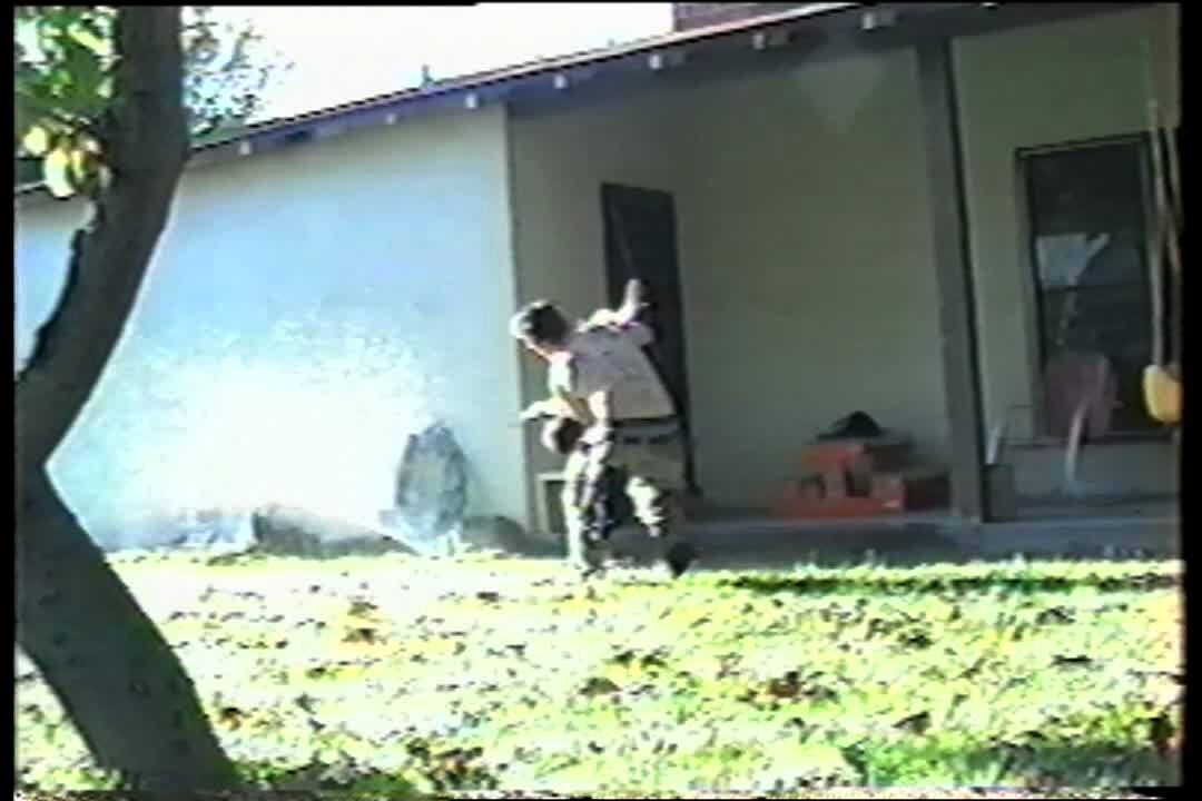 Two teen boys stand in front of a kiddie pool in the yard and a man runs at them from behind to push them in the water. The kids get out of the way and the man trips over the wall of the pool and falls in the water. Security footage.