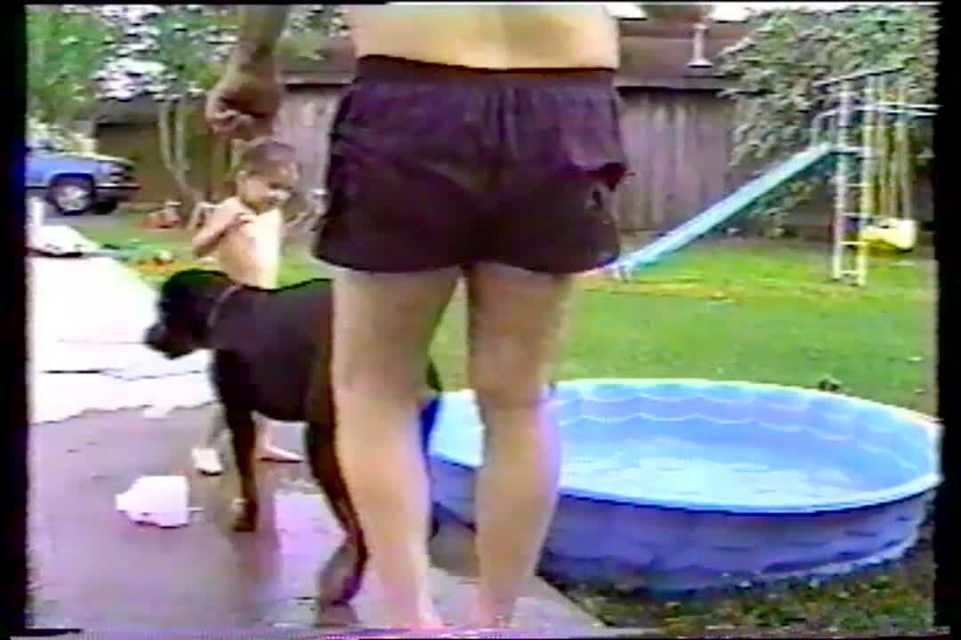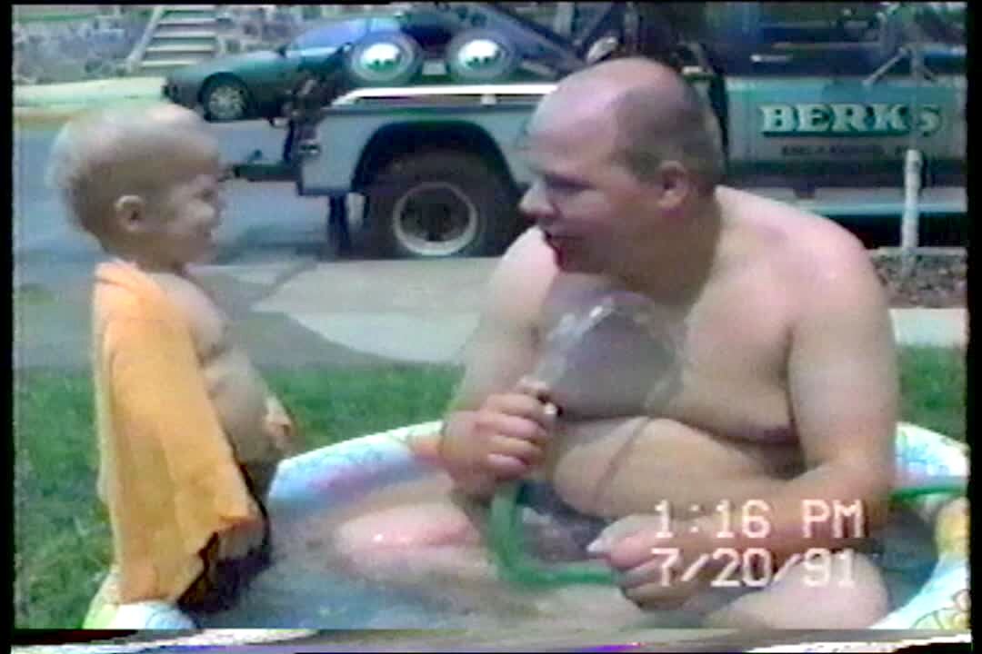 POOL DAD. Dad sits in toy pool spitting water from hose on boy, knocks him over.