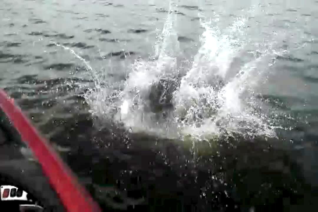 Man is fishing from a kayak. Duck / goose jumps up onto man's back and attacks him, flaps its wings. Man & kayak tip over. Camera is mounted in back of boat.