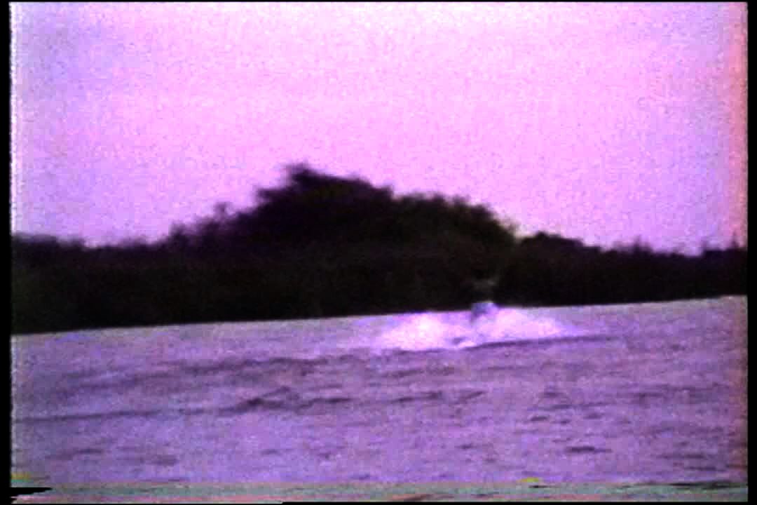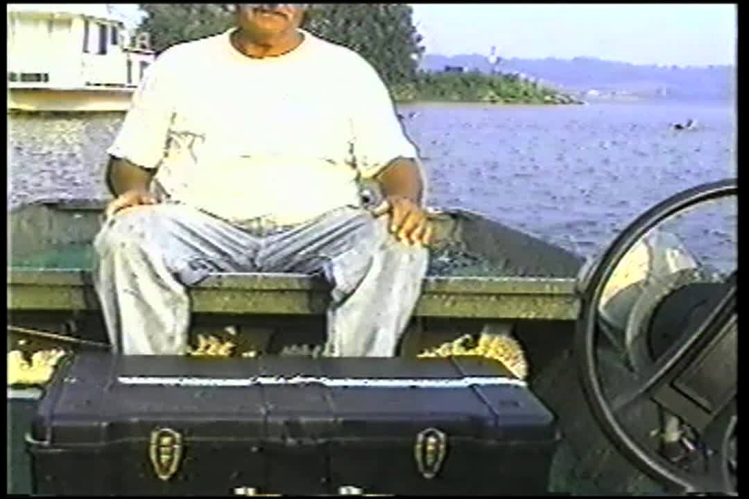 Man gets off boat holding fish, wood board pops up, he trips off dock, falls into boat, drops fish into water. . Date on screen 2001. Fishing.