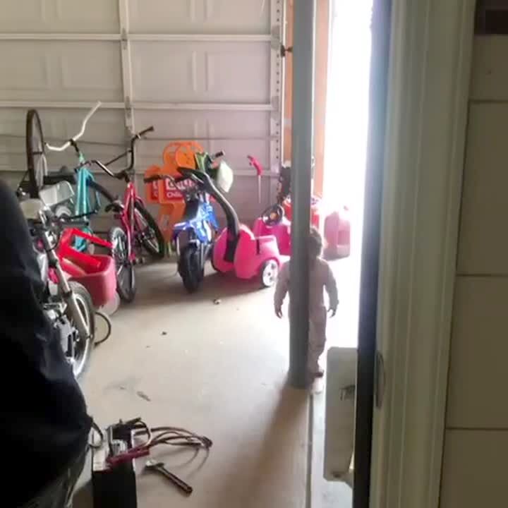 A tot girl hides behind a pole in the garage, and her mother asks where she is. The girl comes out from behind the pole, and her mother says "there you are".