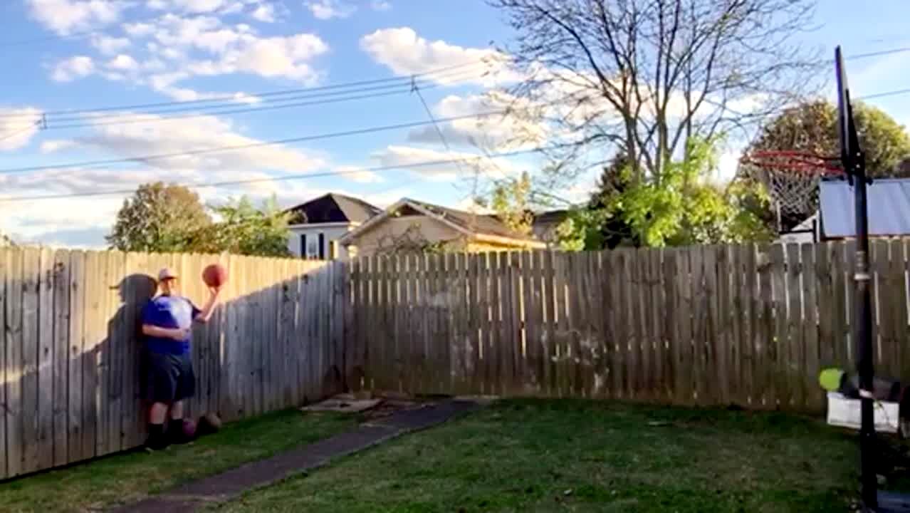 Boy stands under a basketball hoop, gets hit in head by a long shot. No tail.