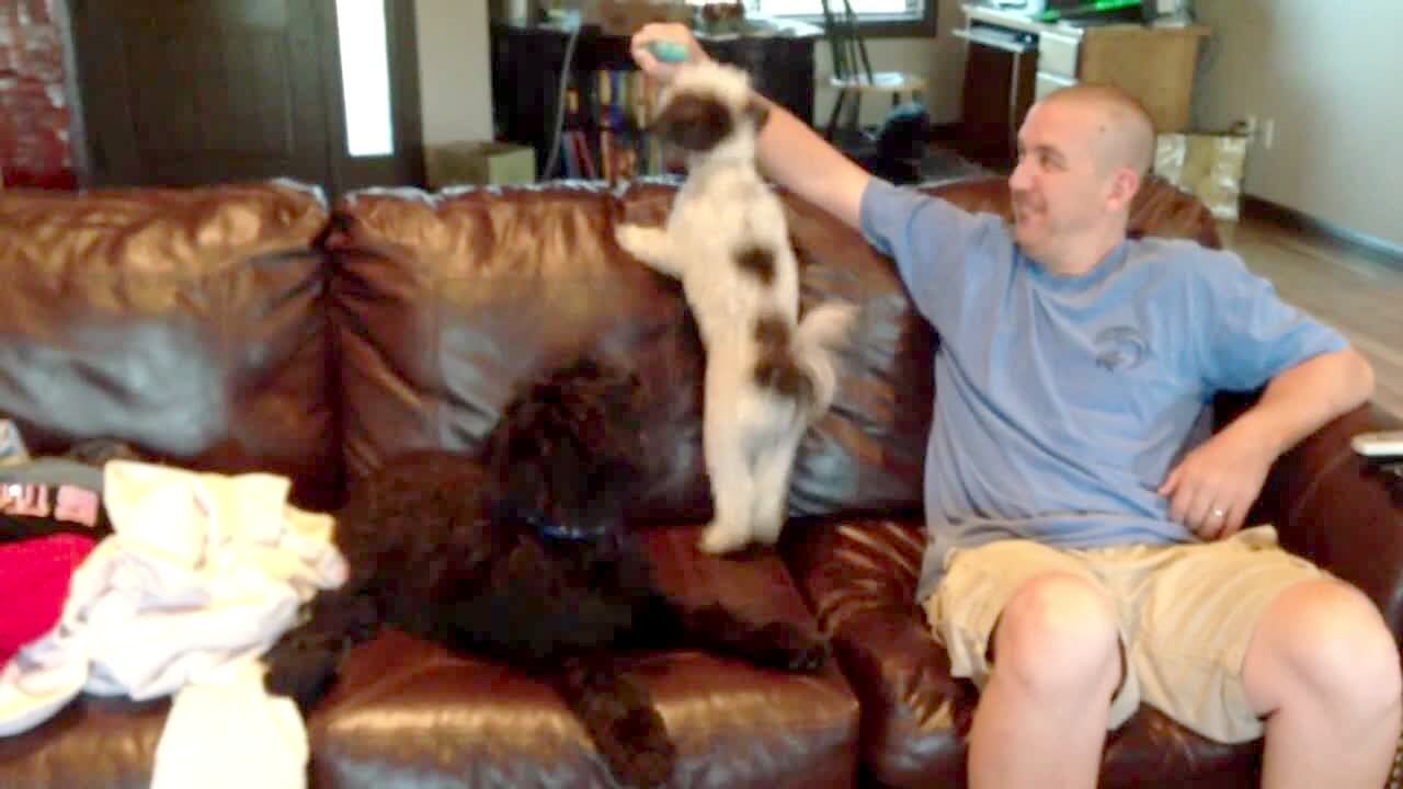 Poodle dog barks the same number of times as man's fingers that are held up.