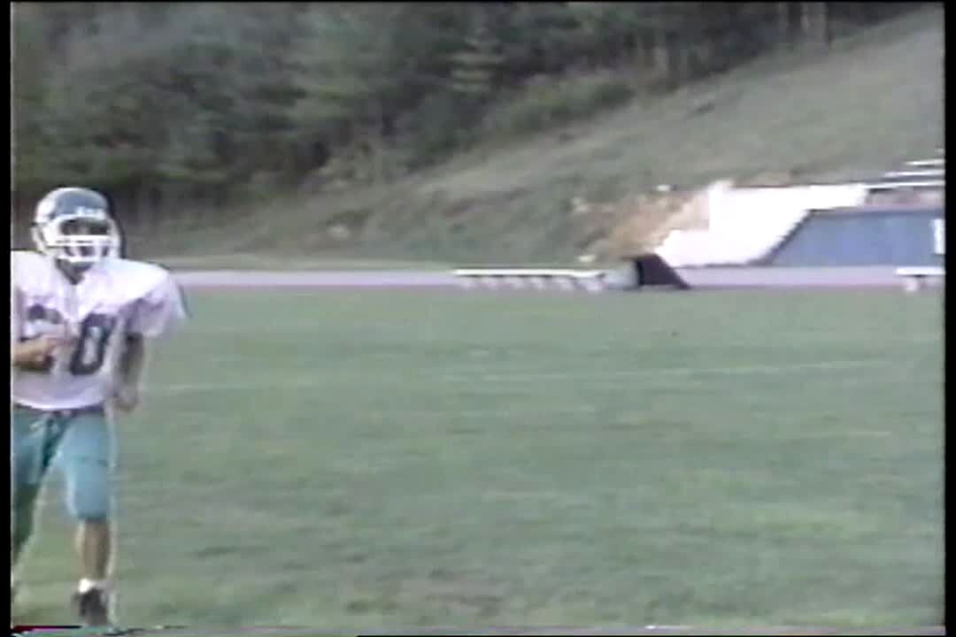 Quarterback in pee wee football game takes the snap, walks with the ball like something is wrong with it, fakes everyone out, then runs for a touchdown. Trick play.