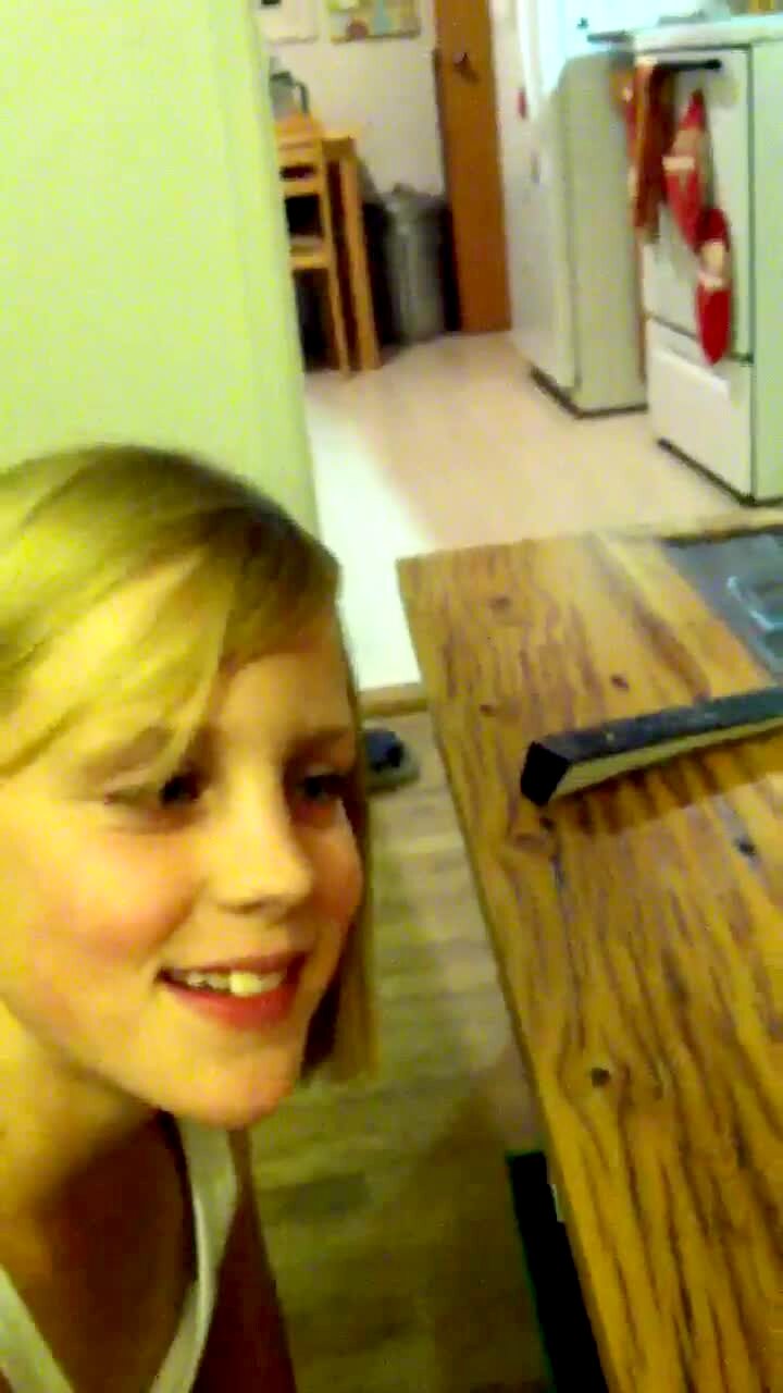 A tot girl wears a granny costume and says her back hurts.The woman with the camera asks how old she is and the girl says "thirty three."