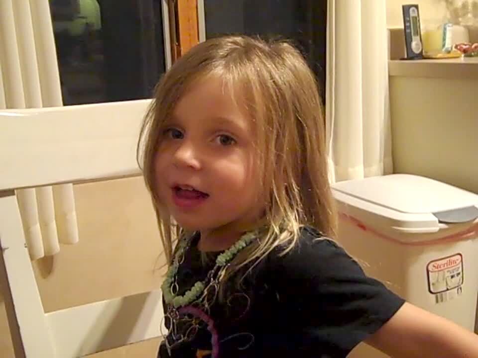 A tot girl makes animal sounds and then blows a raspberry when asked what her dad's butt says.