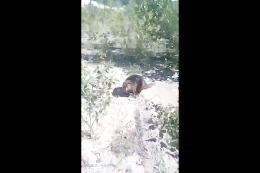 The man behind the camera screams when a beaver rushes towards him outdoors. Short tail.
