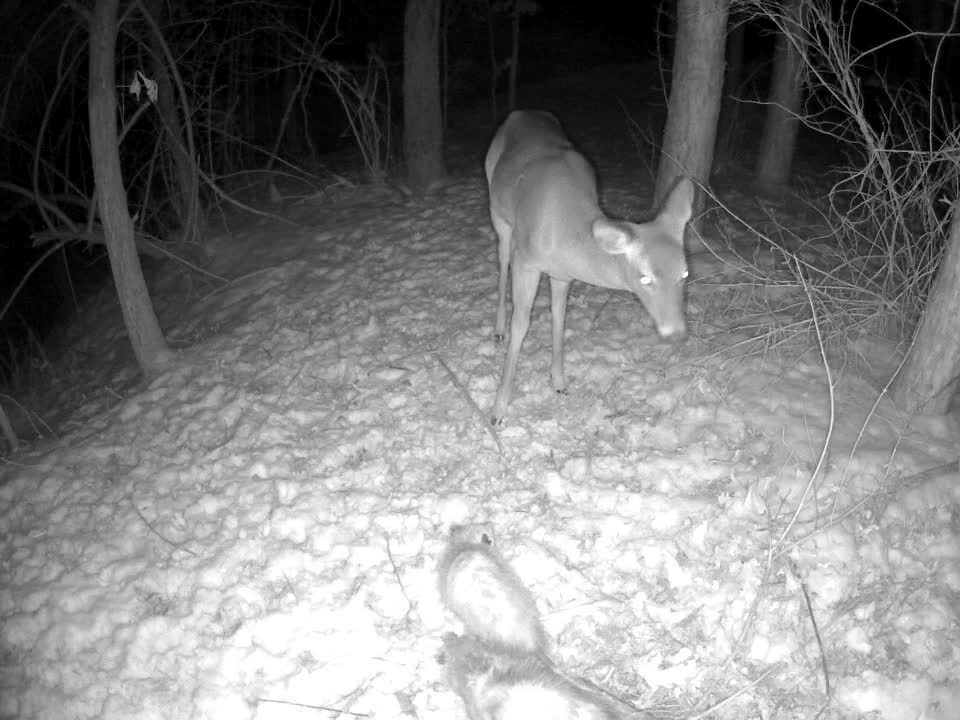 A deer is attacked by a possum in the woods and jumps away. Action at :21. No audio.