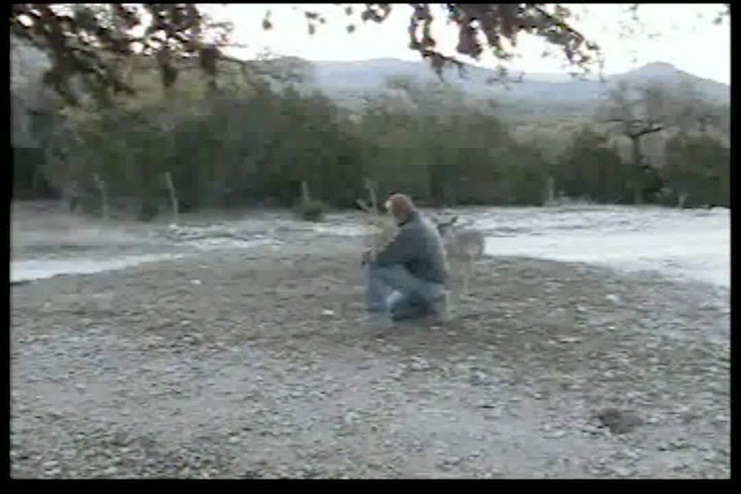 Small dog chases a deer around a man. Deer rears up and kicks the man in the head.