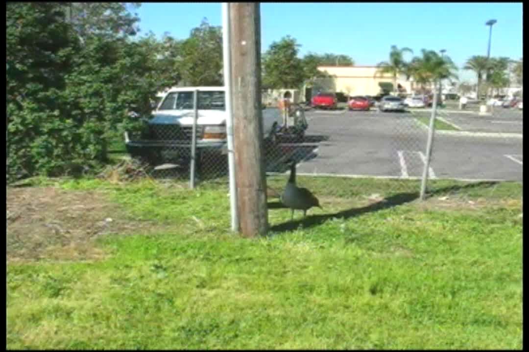Man films 2 geese. A goose starts chasing man & attacking him. Man trips & falls while running in the dirt. With recovery.