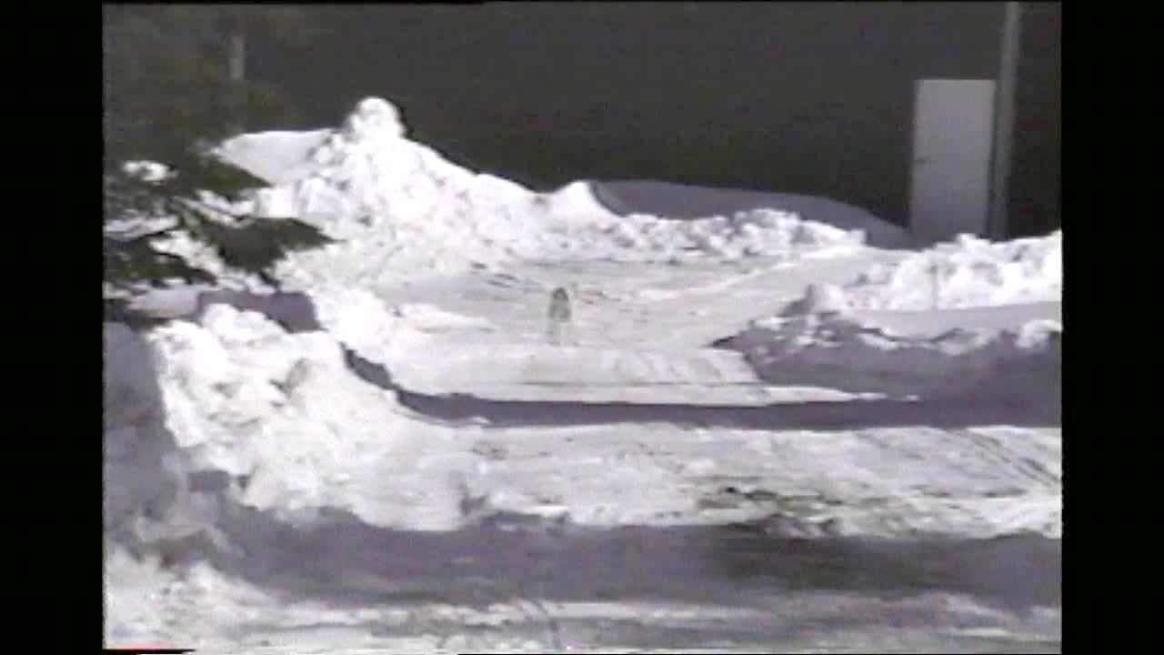 The man behind the camera walks over to a muskrat on icy snow outdoors. He talks to the muskrat and the muskrat charges at him. The man screams like a woman and falls over.