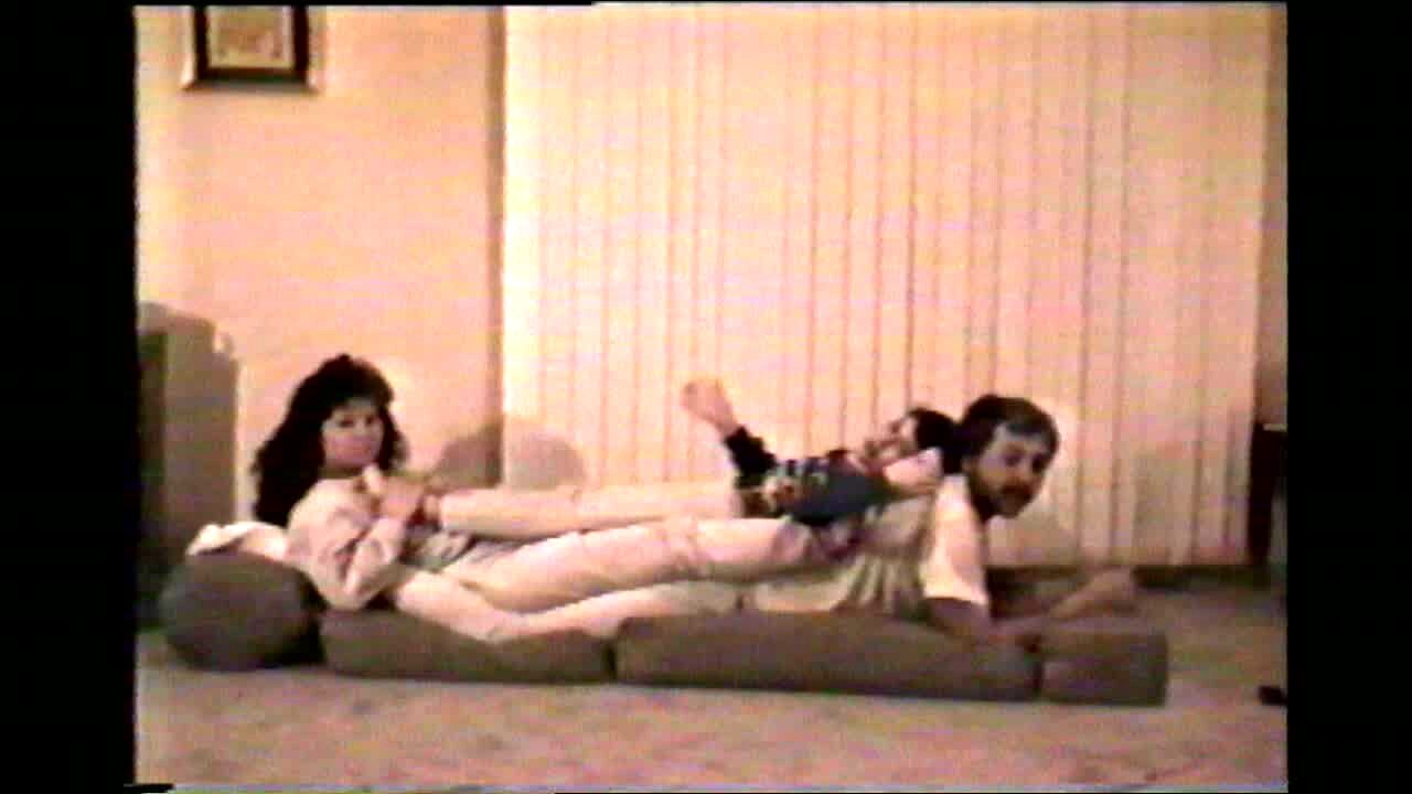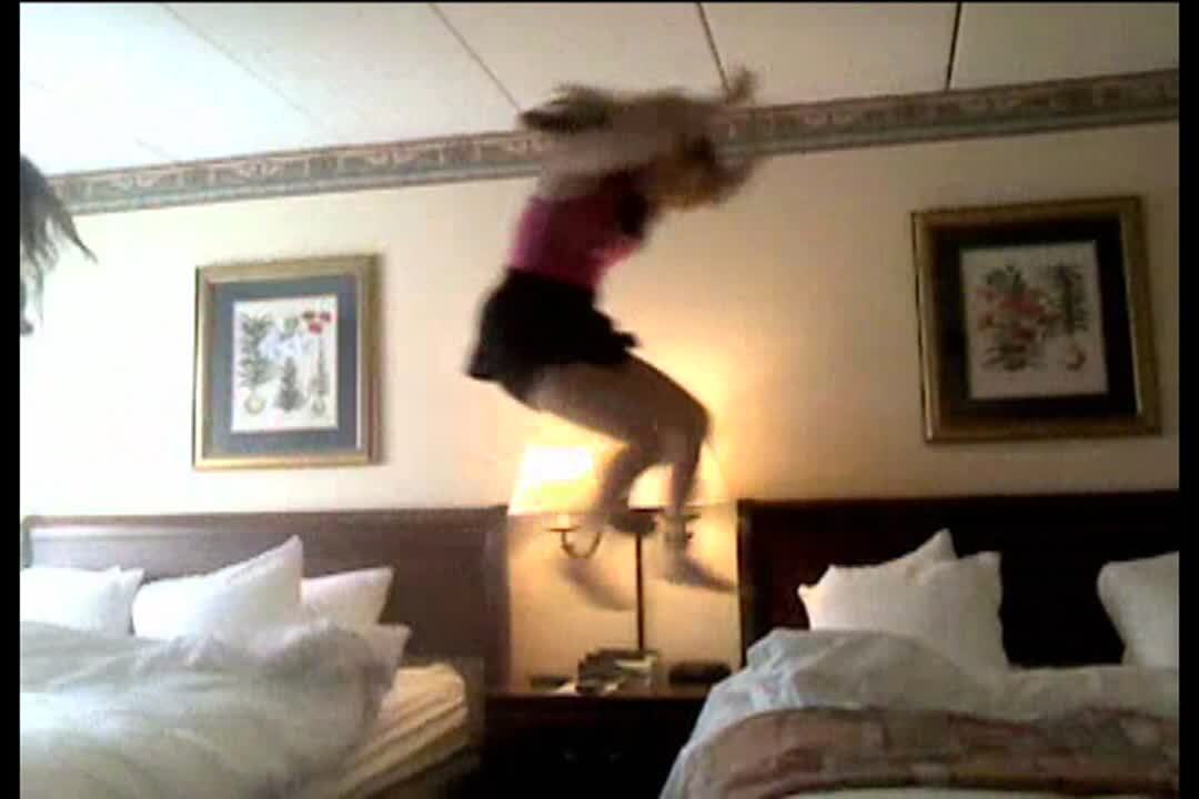 Young women jump on hotel beds, one does a flip and 2nd girl tries it. The 2nd girl flips out of frame. Falls. Bonehead.