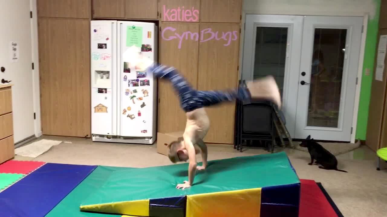 A young boy does a flip. A young girl does the same flip but hits a wall as she finishes..
