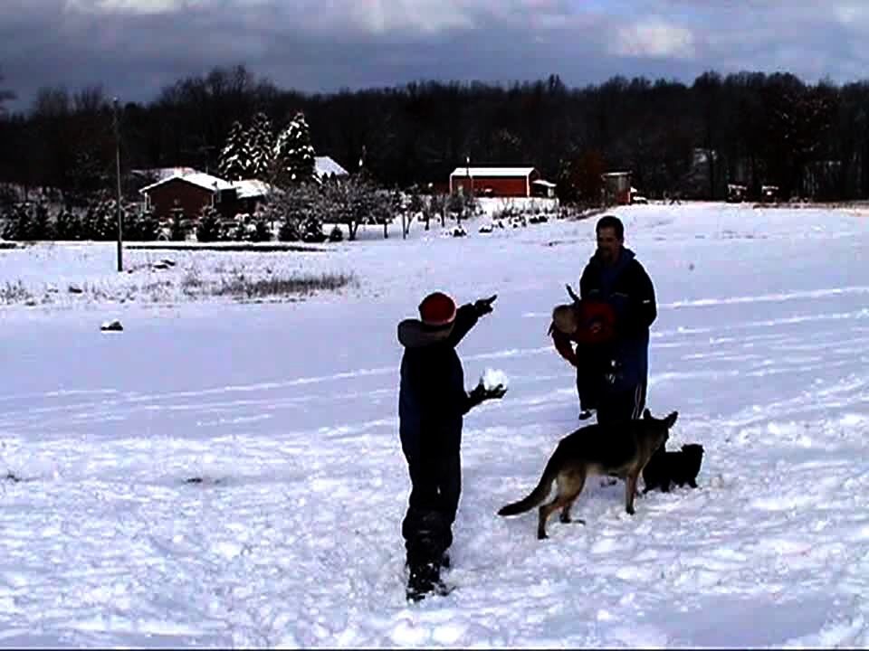 A young boy and a tot boy throw snowballs at their grandfather in a winter snowy yard. He throws a snowball back and it hits the tot in the face and snow lands in his mouth.