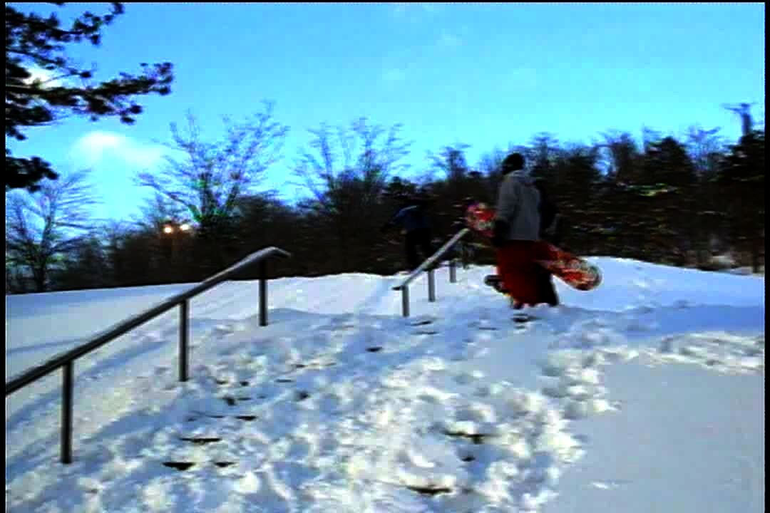 Teen boy tries to slide across a rail on his snowboard & falls. Short tail. Winter. Very short clip.