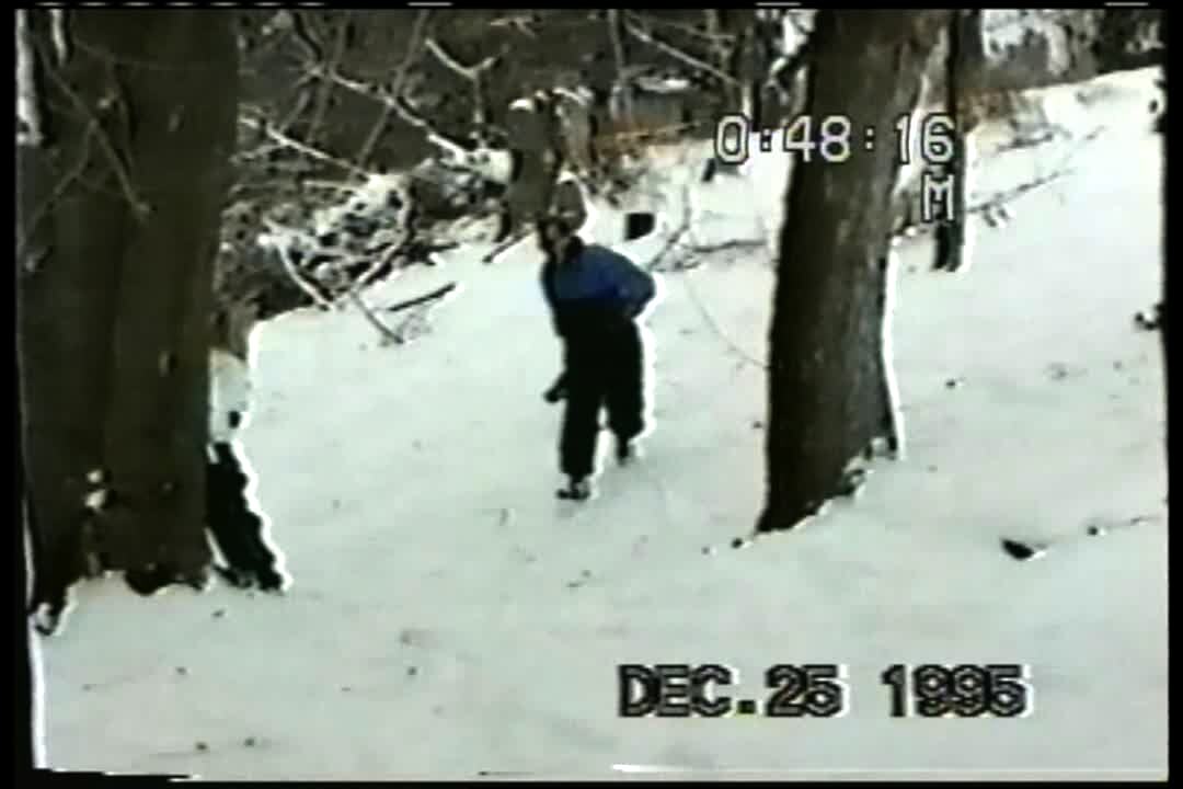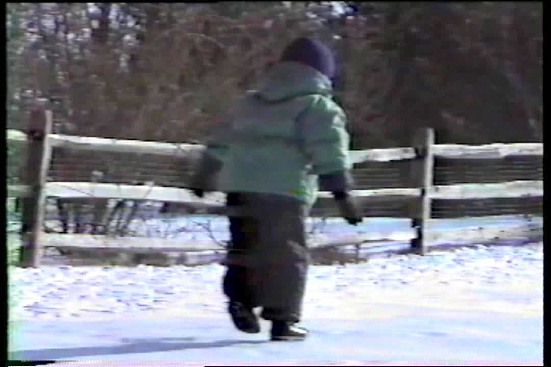 BOY SLIDES ON ICE Boy almost snow slides into dog poop down snowy hill. Points it out to dad.