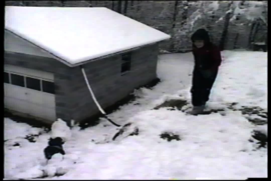 A boy slides and jumps off a roof into deep snow outdoors. He walks back up onto the roof to do it again and just after his dad tells him to watch out for a nail, the boy slides down and gets caught on the nail, then hangs over the edge of the roof.