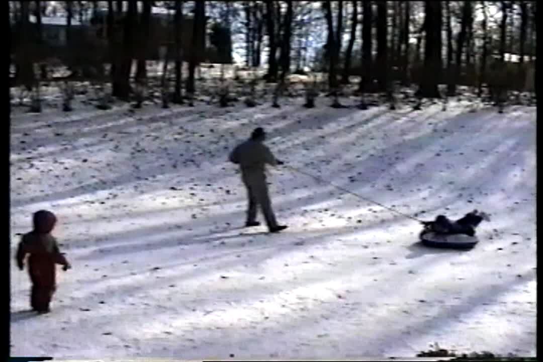 Boy on new sled, his dad pulls him. Dad tries to pull him off a jump. Boy flips over the front of the sled and does a face plant in the snow. Winter.