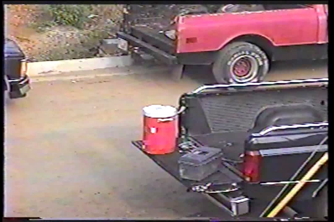 Tough man screams when he opens tool box & fake rodent is hanging inside it. Scare, practical joke. Surprise. Construction worker.