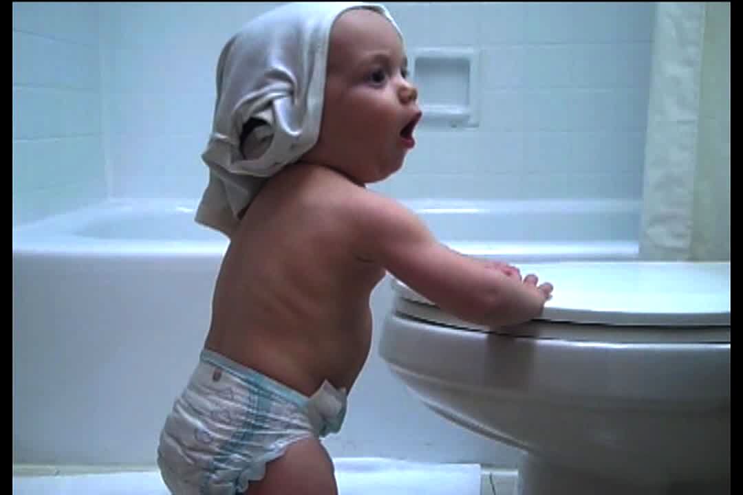 Tot girl pees on the toilet, mom sits on edge of the bath tub talking to girl. Mom falls into the tub & gets stuck. Tot gets kicked in the face when mom falls. Bathroom.