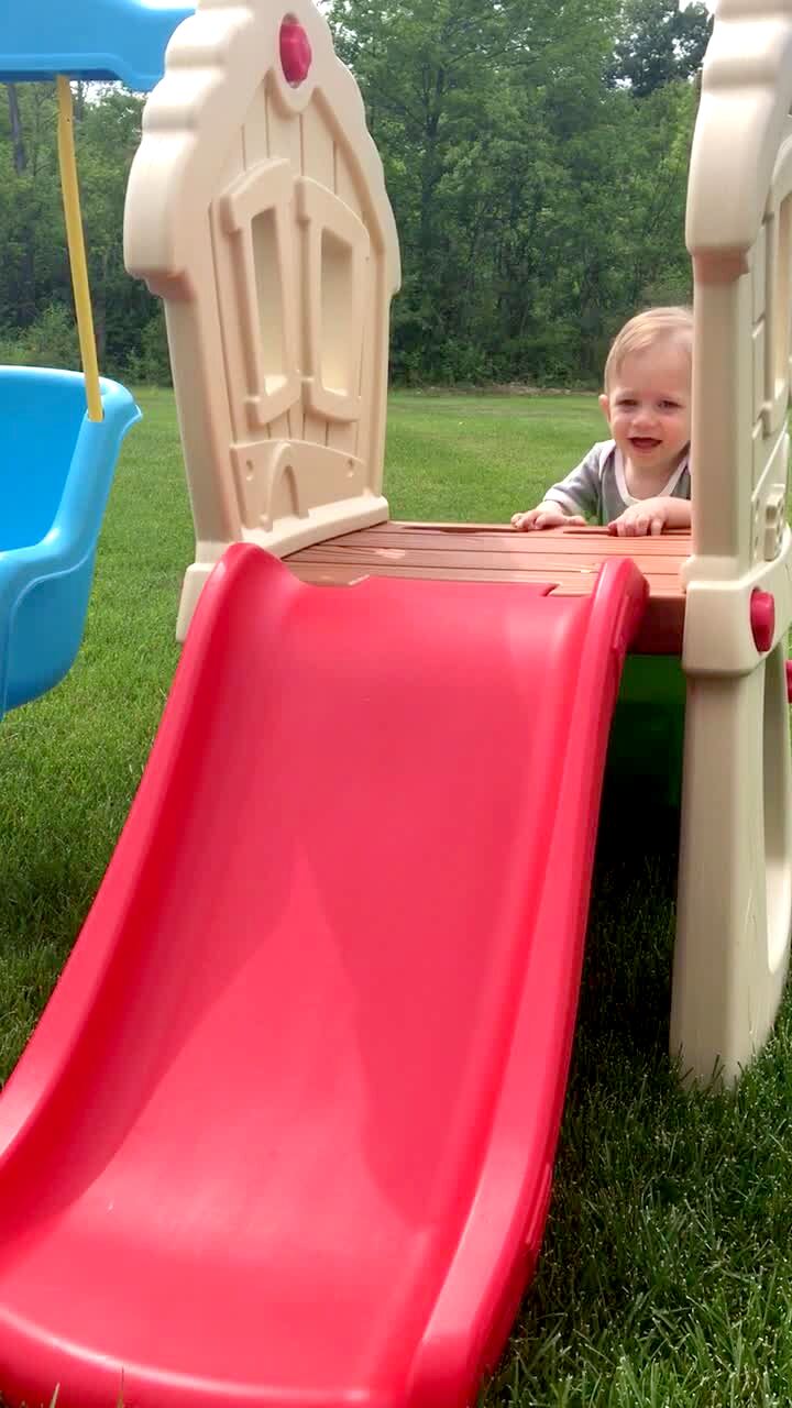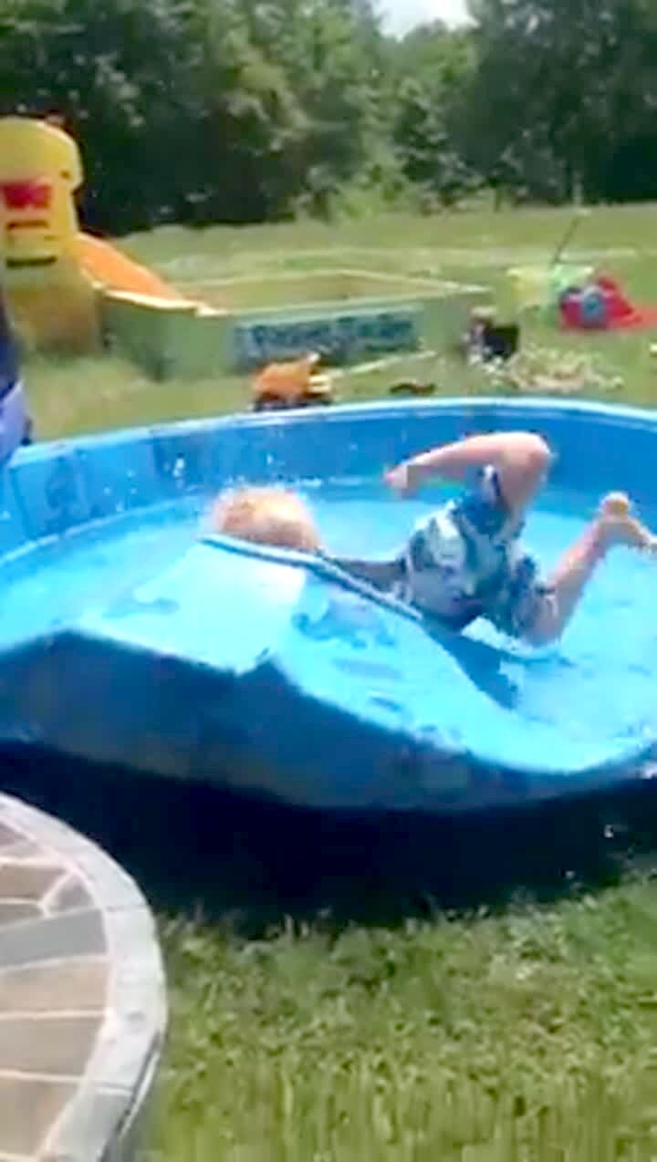 A tot boy tries to jump into a kiddie pool, but slips and falls in. He quickly gets up and says "nope".