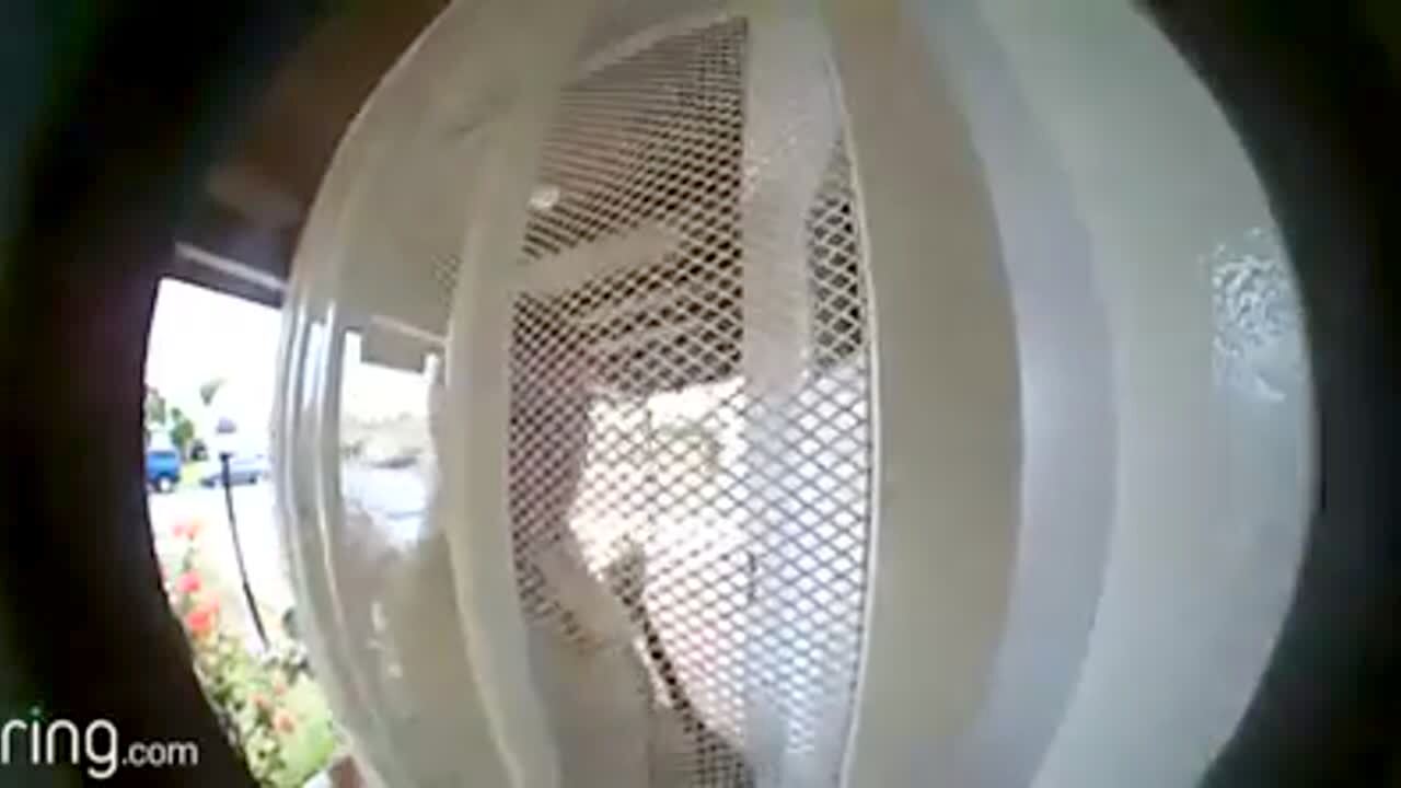 A tot boy falls into a planter on a porch while his mom locks a door. Security camera.