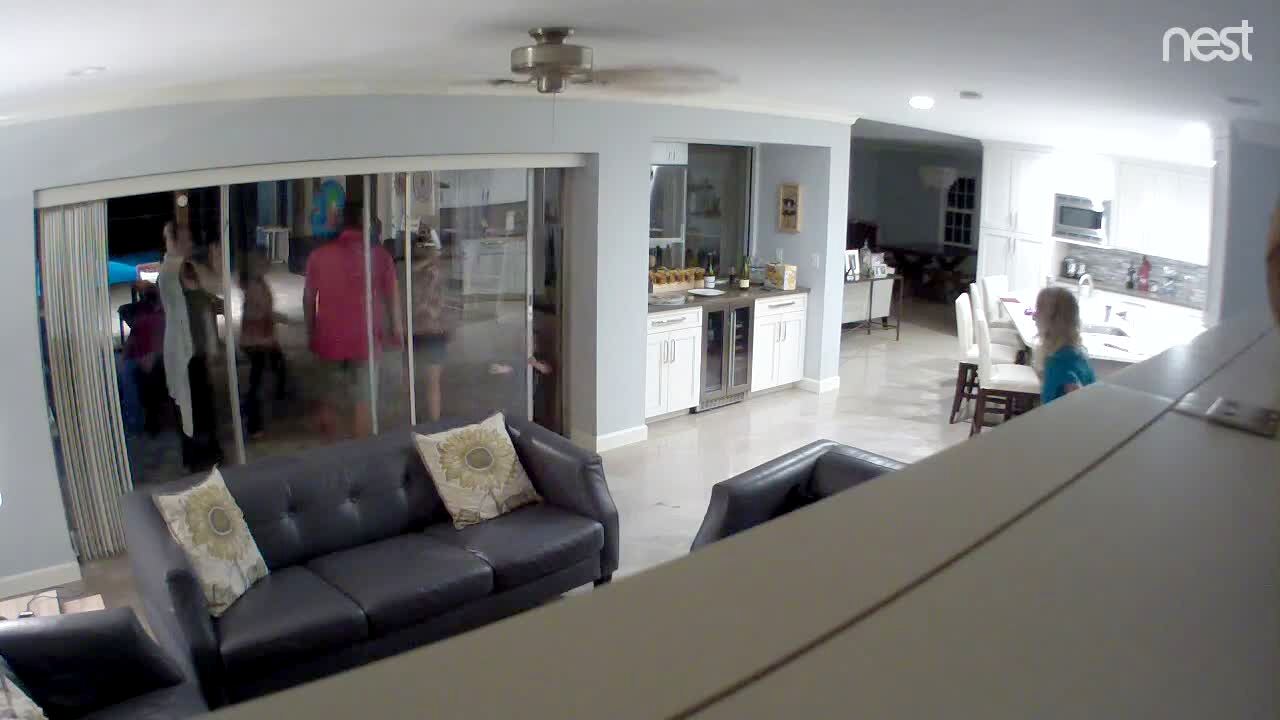 A young girl runs into a closed sliding glass door with a loud bang and falls down. Music plays in background. Nest security camera.