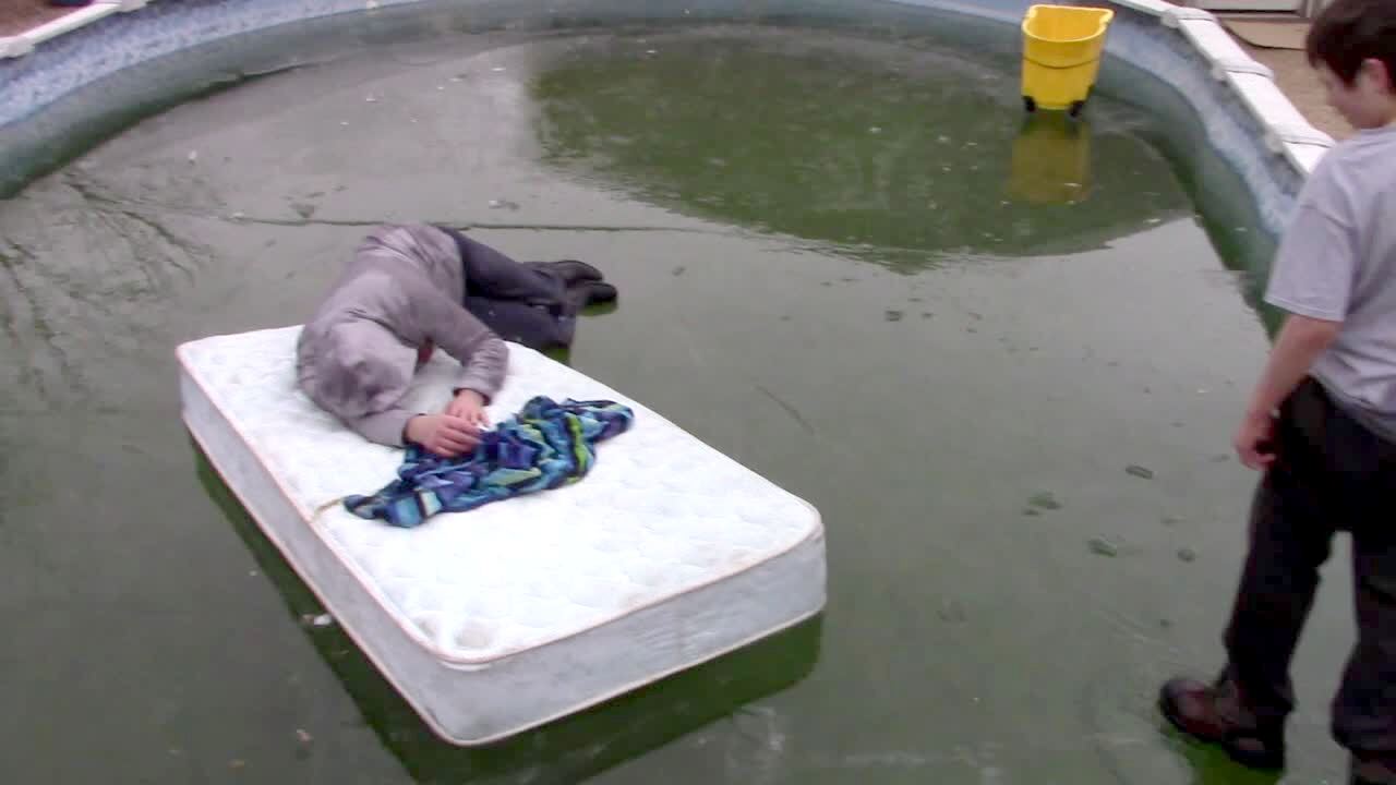 A man jumps on a mattress on a frozen swimming pool and hits his head on the ice.
