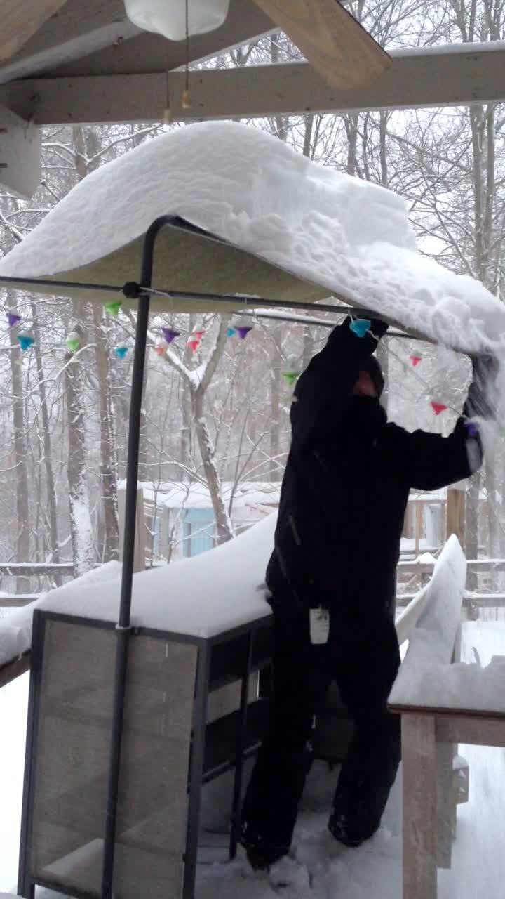 A man pokes at snow on a roof over a porch with a stick and the roof collapses.