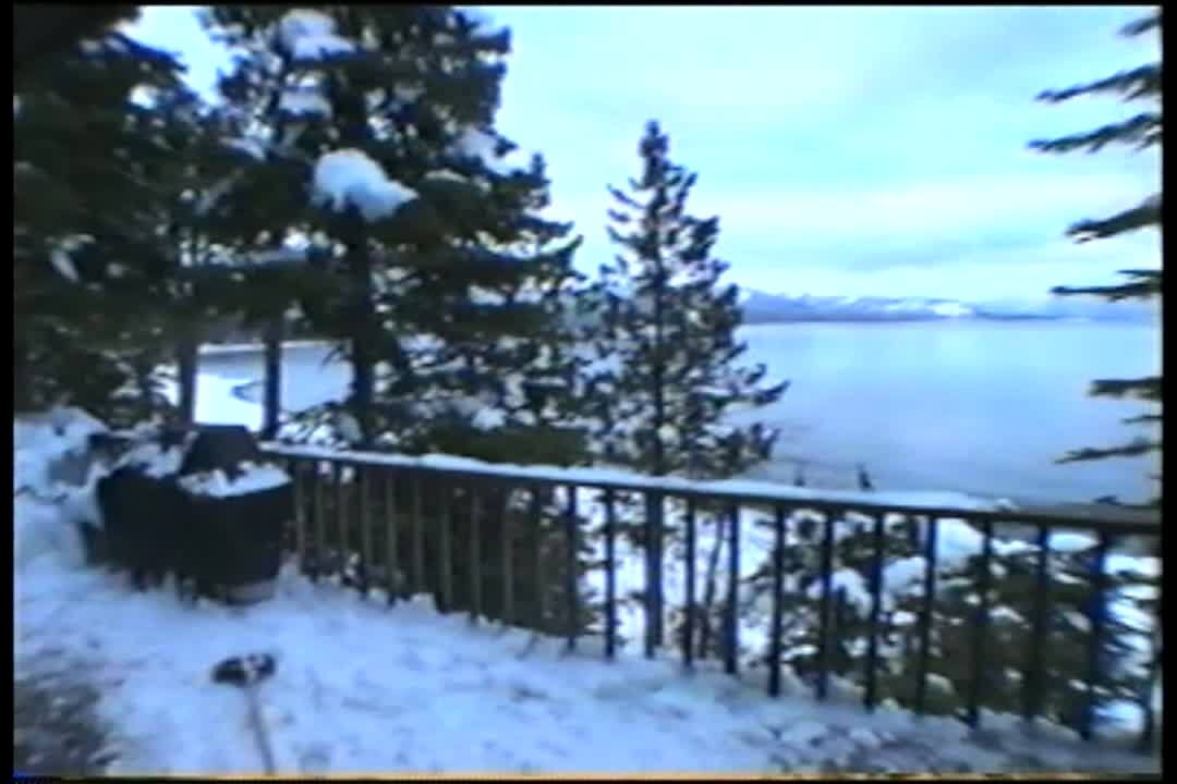 Man tries to break icicle off roof and he falls off the porch. He keeps doing it for the camera.