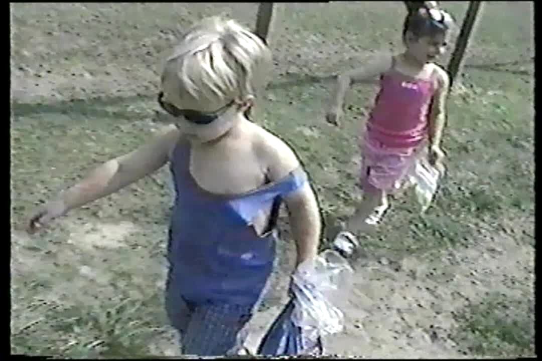 A woman discovers a white powdered footprint trail that leads to a tot boy and tot girl's room where the floor is covered in baby powder and the boy and girl skate and slide in it, unaware that what they did was wrong.