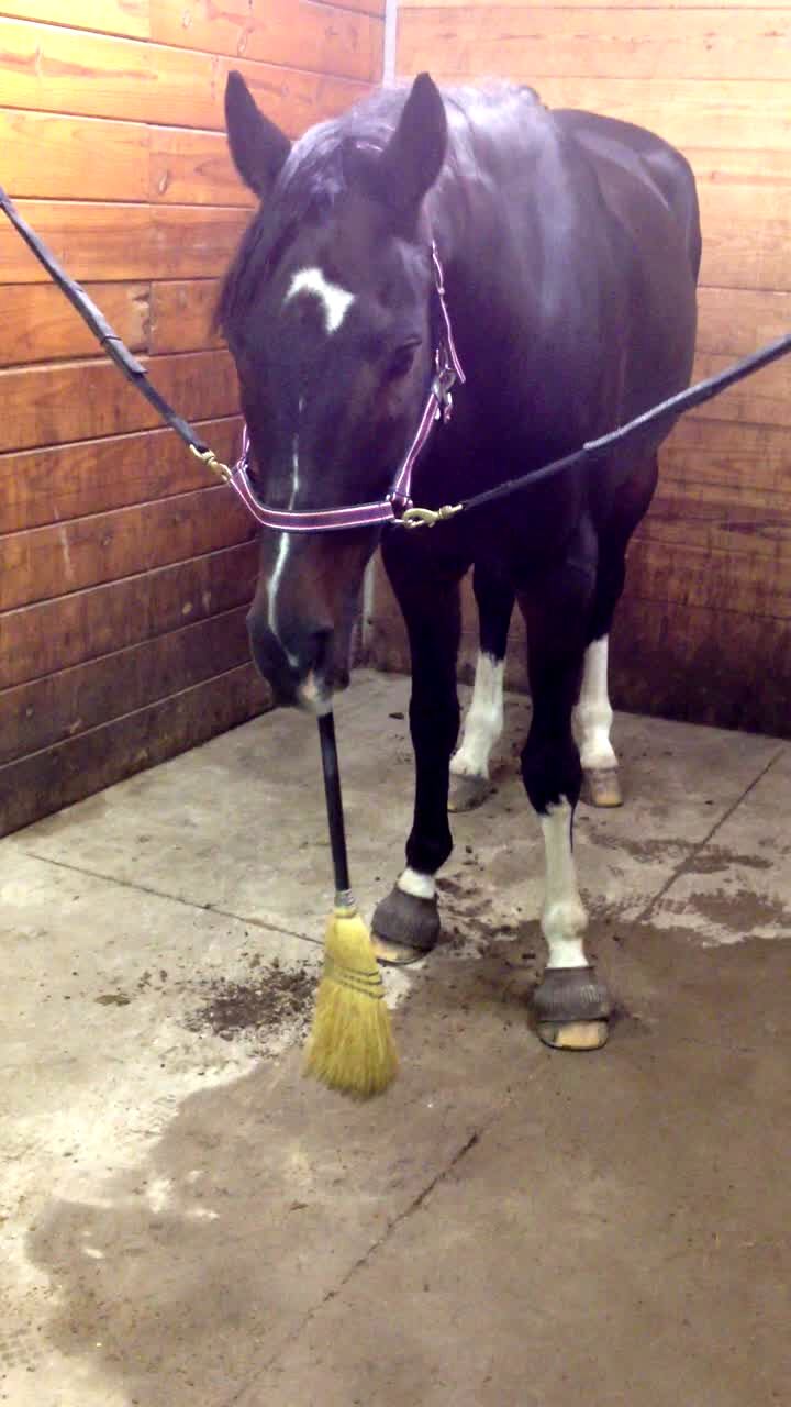 A horse holds a broom in his mouth and sweeps the floor of his stable with it.