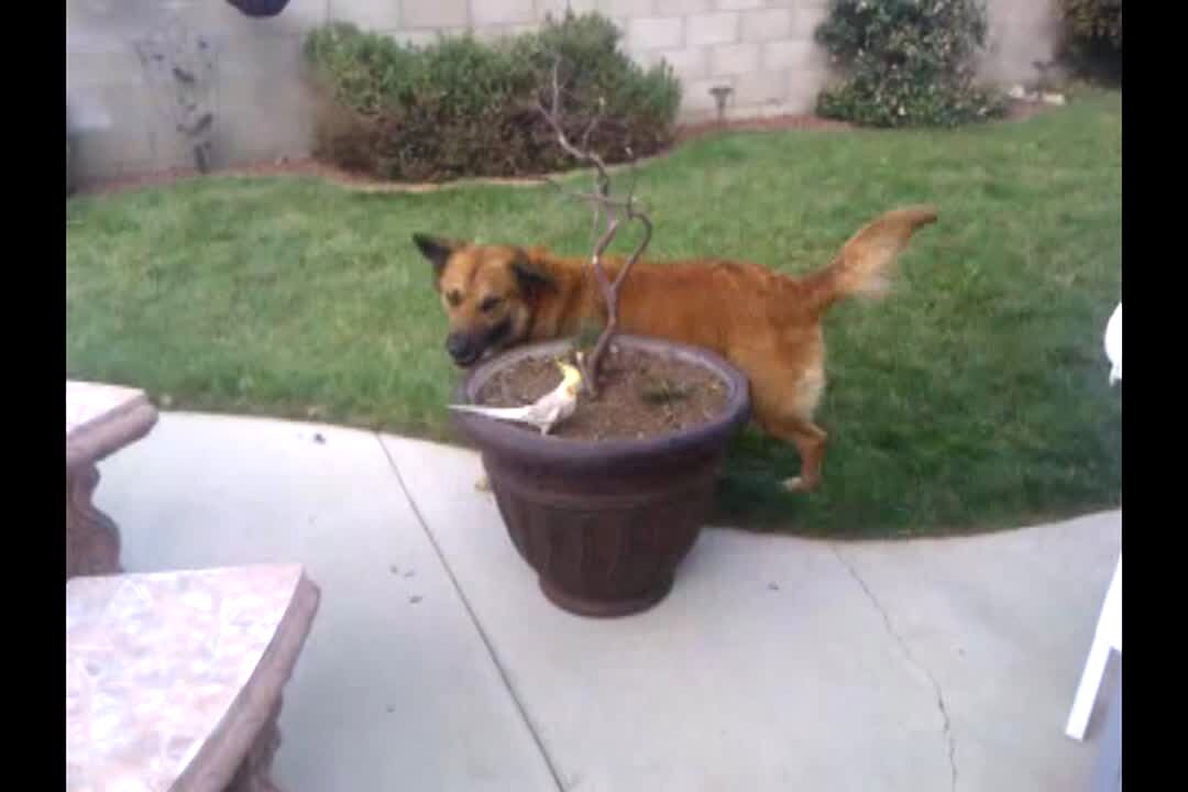Cockatiel walks around a planter, and mixed breed dog follows it.