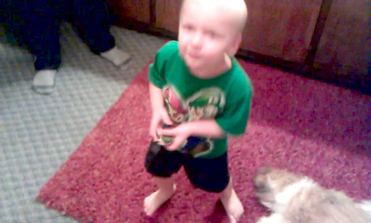 A young boy sits in a chair with a carton of Easter eggs. Then he spills all of the eggs out of the carton on the floor. Camera jerks down and cuts out as he's spilling. No tails.