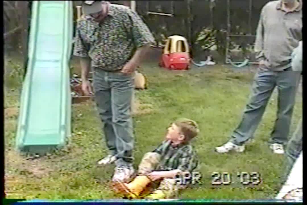 Boy on an Easter egg hunt hits a man in the crotch who jokingly steals his Easter basket. *tracking off .