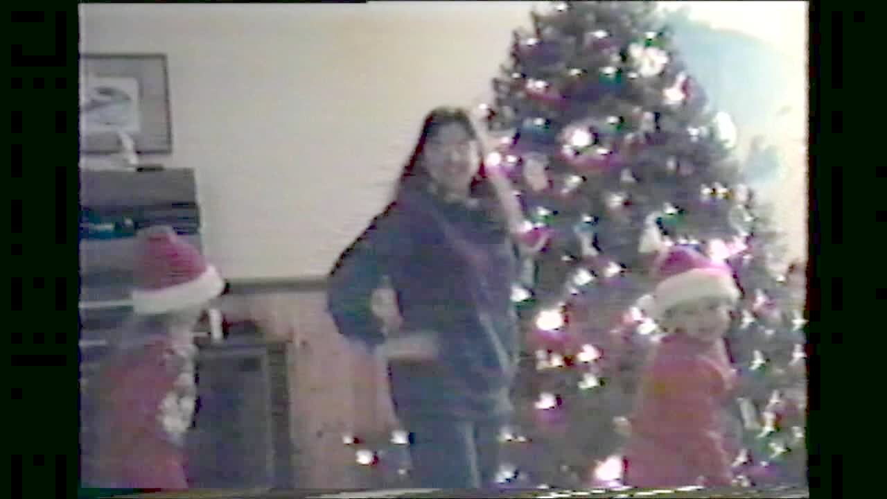 Woman sings "Deck the Halls" and a baby boy sings the "Fa La La La La" part. Christmas. Living room.