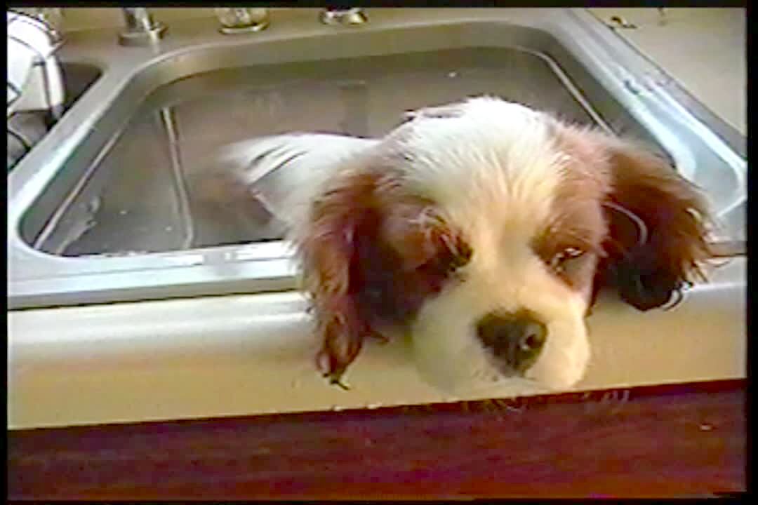 Cute cocker spaniel puppy dog falls asleep in the sink during its bath. Funny visual.