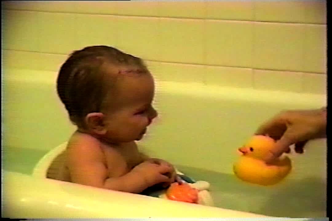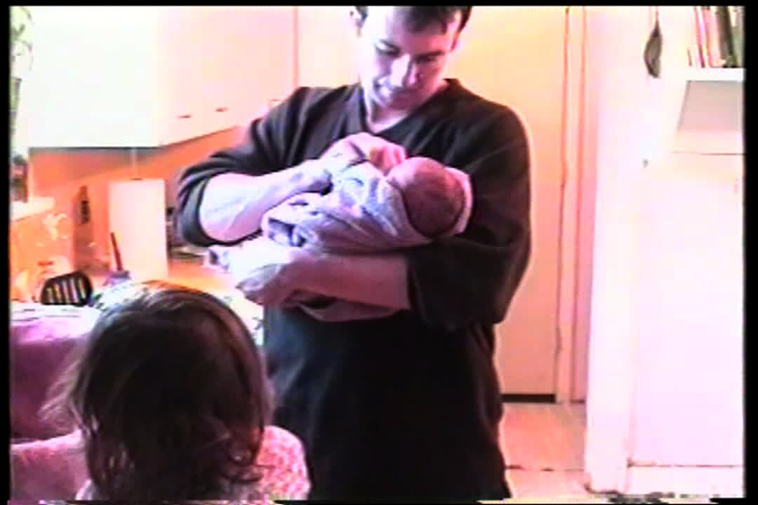 Baby pees onto dishes in kitchen sink after its first bath. Dad holds baby, Mom says "he's going to pee in your face."