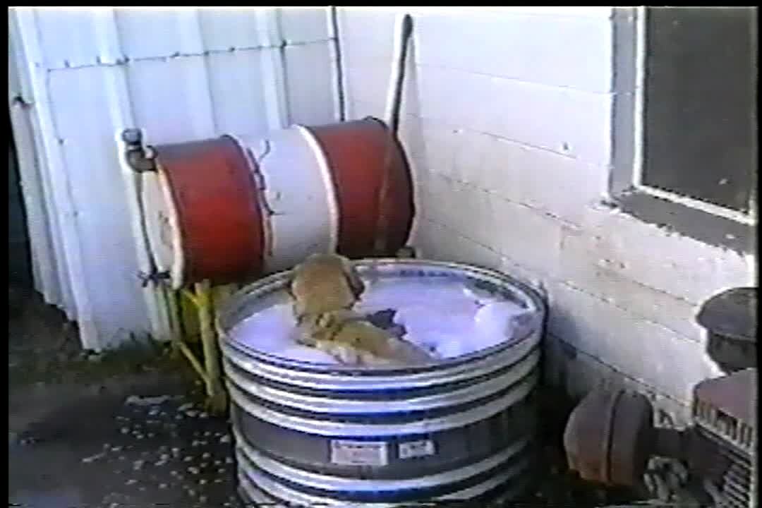 Dog Bath. Dog in bird bath, walks, drinks, then lays down.