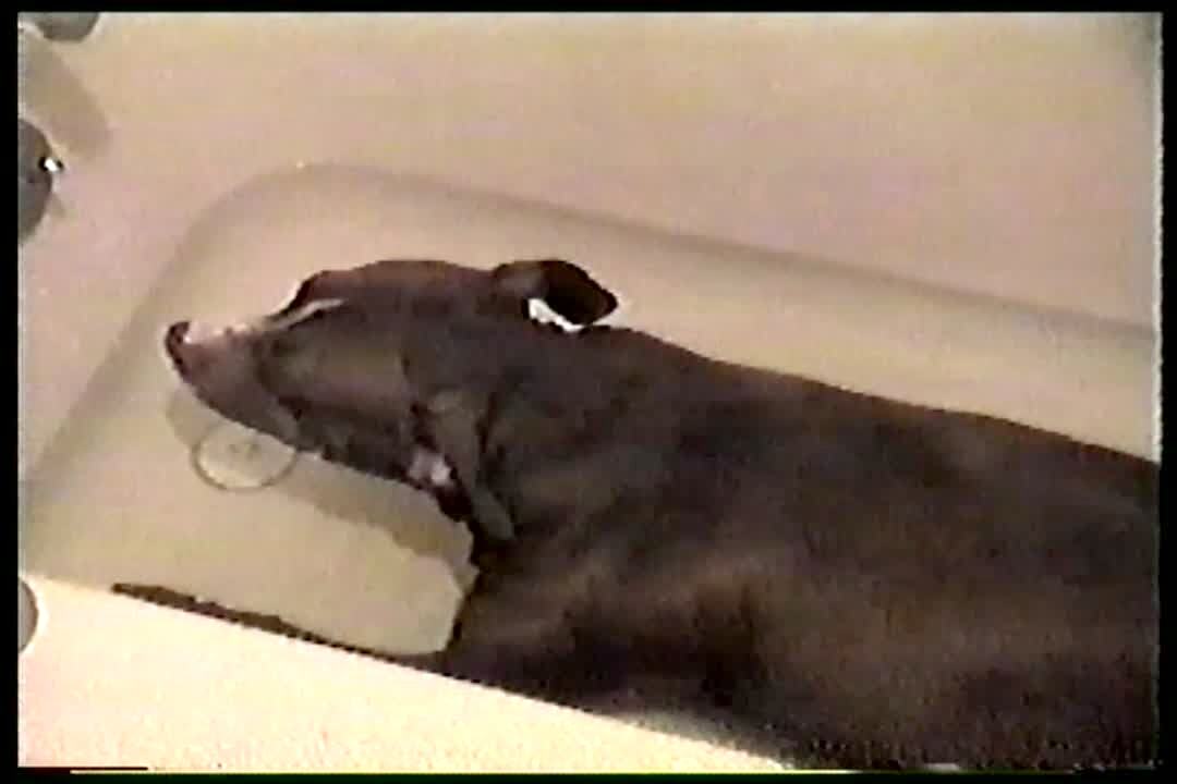 Dog takes bath in small tub, walks in circles, plays in bubbles