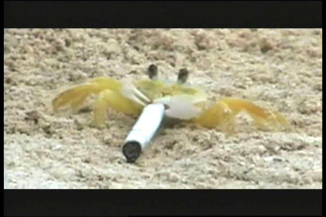 Crab holds and looks like it's smoking a cigarette on the beach. Funny visual. Summer.