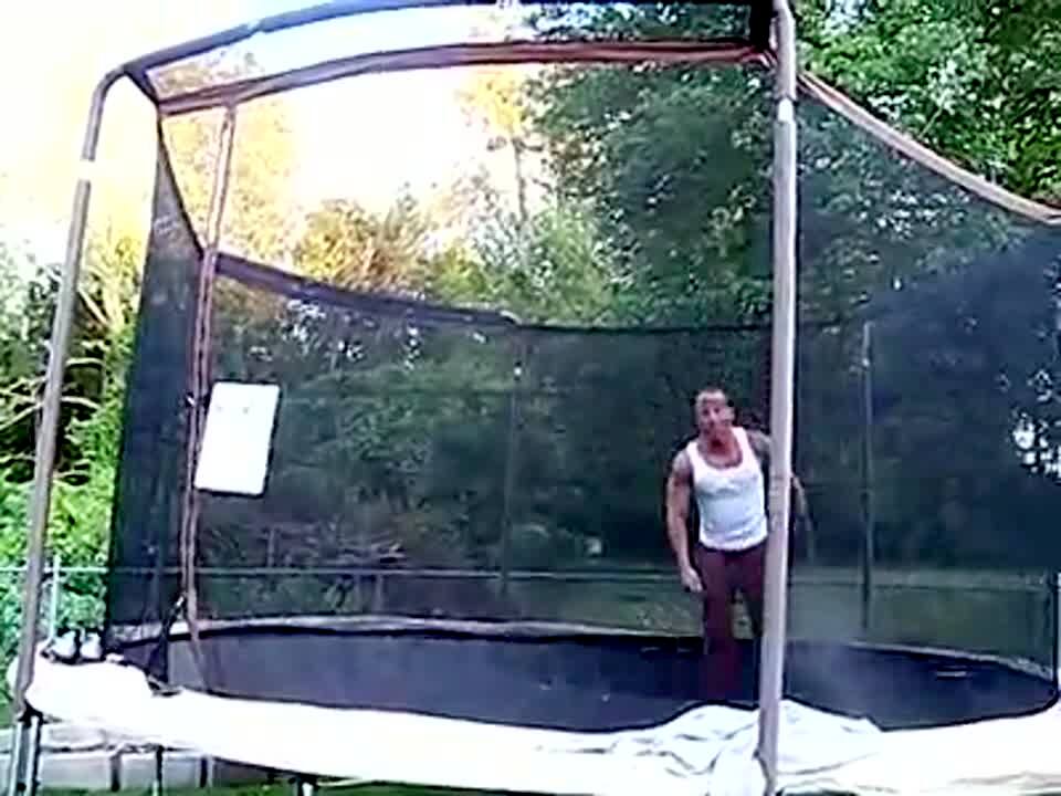 A man jumps on a trampoline in the yard outdoors and does a back flip and the trampoline breaks when he lands and he falls on the ground.