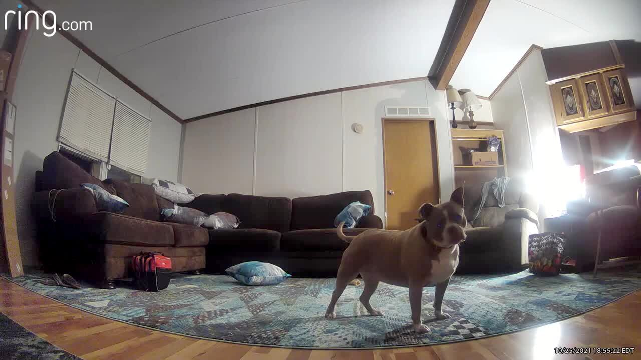 "Camera Confuses Canines" A dog sits on the living room floor and reacts with a bark when its owners talk via the Ring camera. Another big dog comes out after it hears its owners. A man and woman cackle when both dogs put their faces up to the camera to investigate. Security footage.