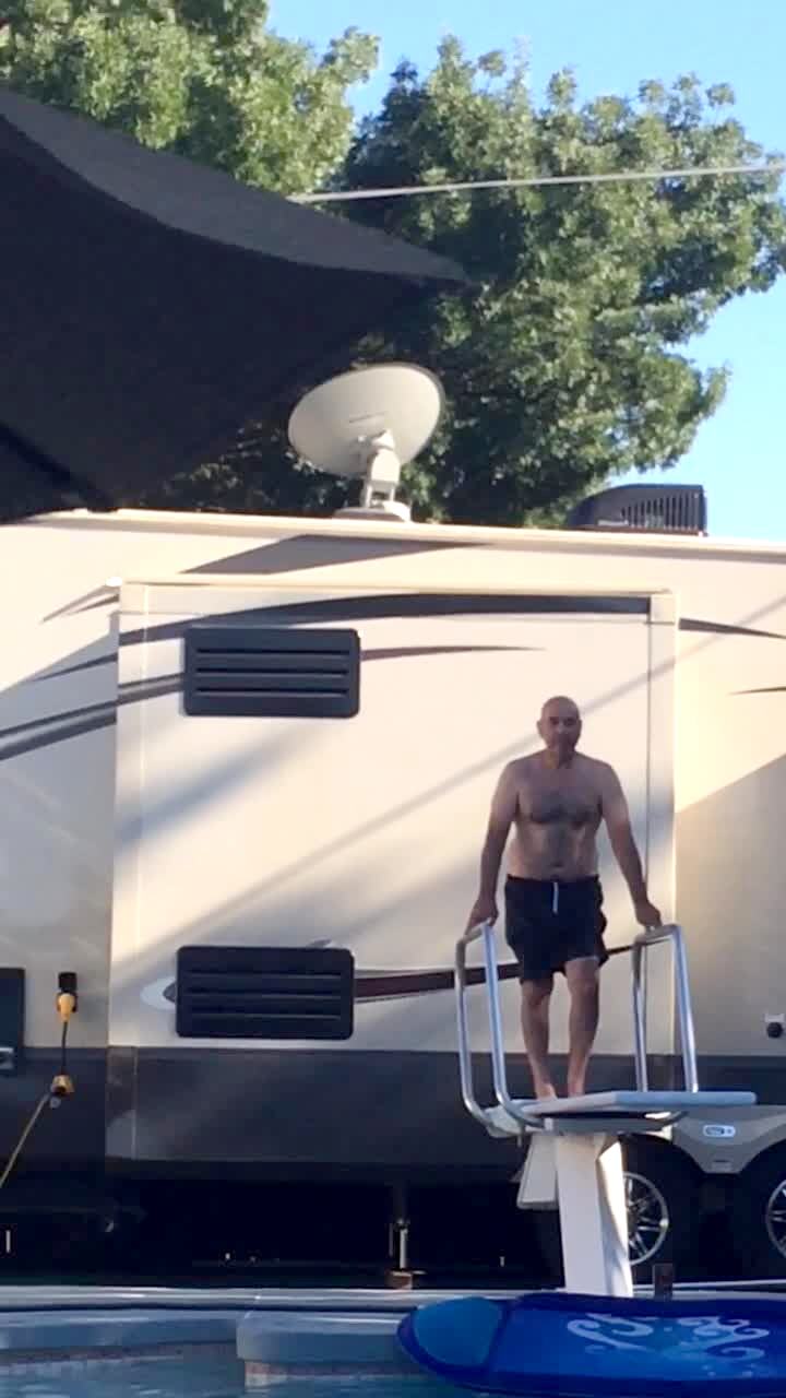 A man jumps on a diving board at a pool, but slips and falls head-first into the water. Featured talent cleared (the man on the diving board).