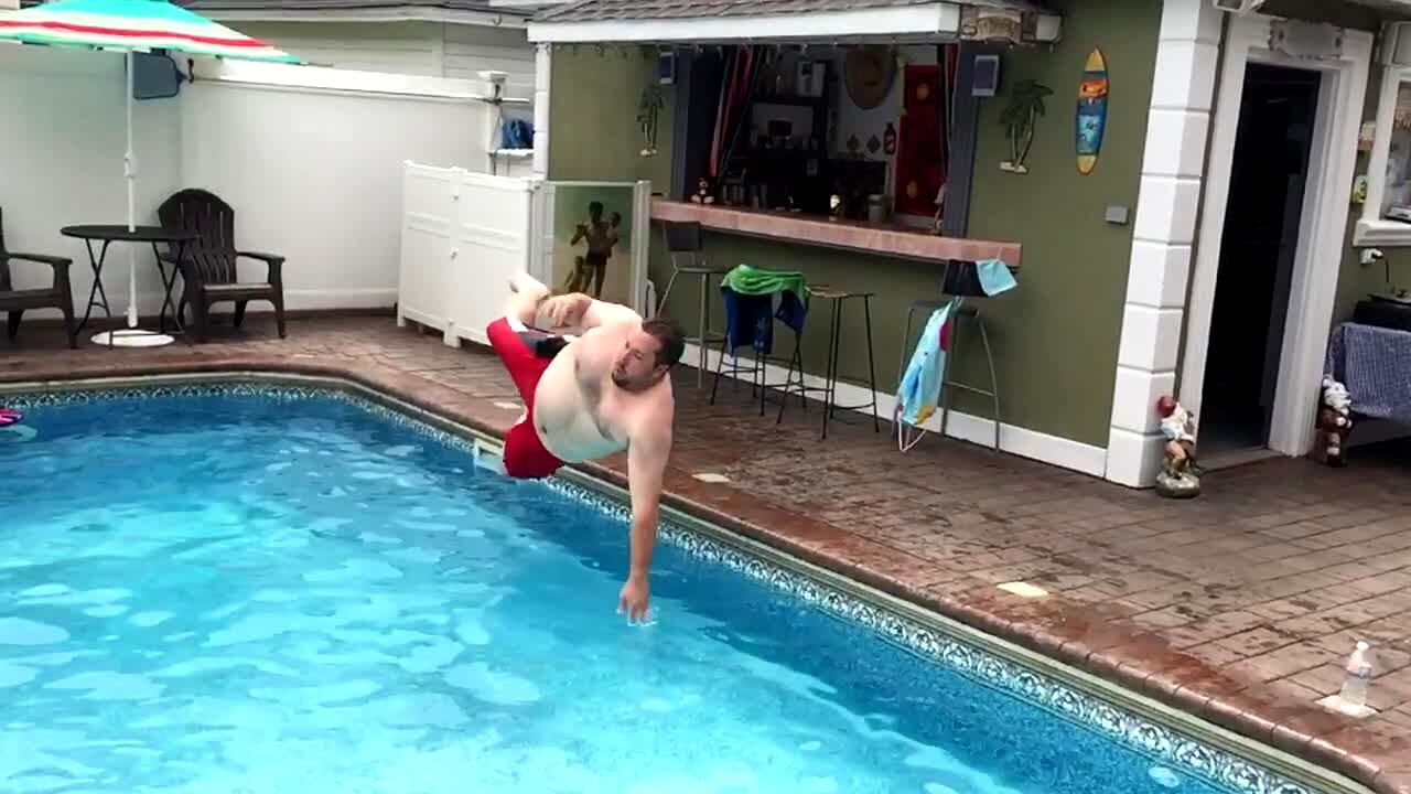 Two women pick a third woman up to try and throw her in a swimming pool at a gathering. Instead they drop her on the cement pool deck, and one of the instigators falls in the water. Feature talent cleared only (the two women carrying their friend and the friend).
