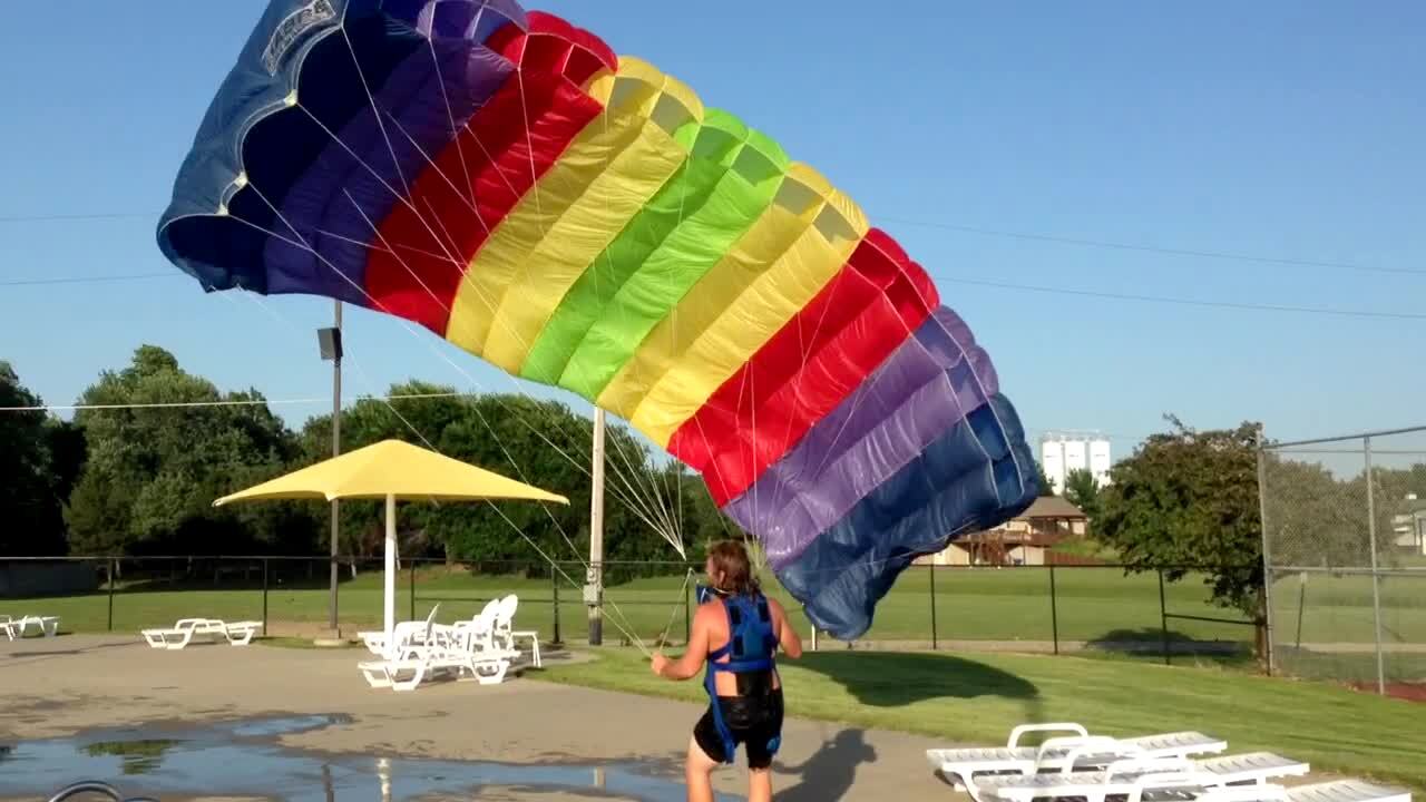 A man is thrown into a swimming pool outdoors when heavy wind pulls his parachute.